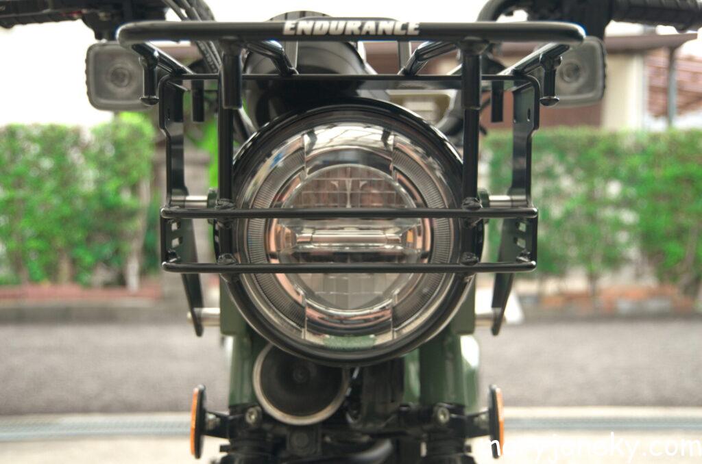 ヘッドライトガードは、ハンターカブの丸目を邪魔しないクールなデザイン。