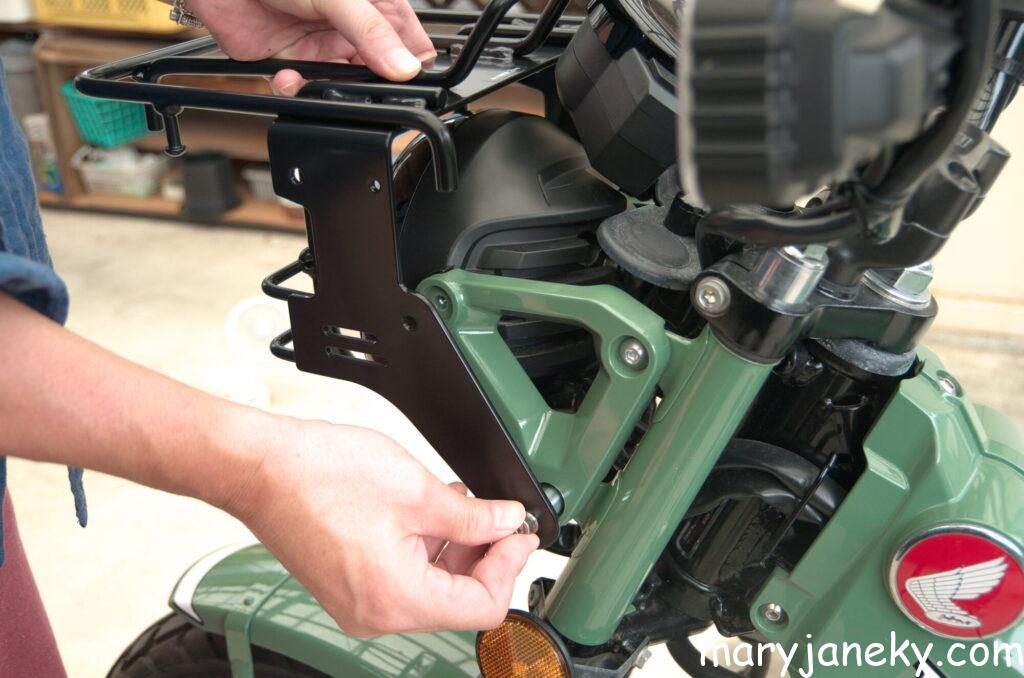 ヘッドライトブラケットのボルトを4ヶ所外し、フロントキャリアをボルトで止める簡単な作業です。